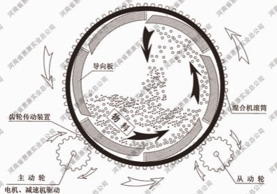 攪拌時,物料隨筒體沿逆時針方向旋轉(zhuǎn)的同時,在慣性作用下向左推移,從而達(dá)到混合目的。